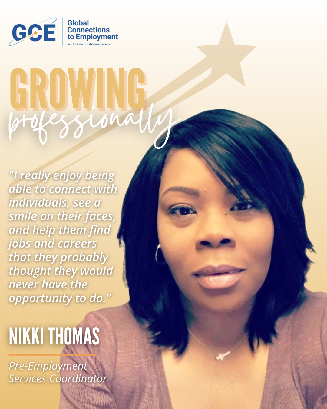Nikki Thomas helps individuals with disabilities prepare for and secure meaningful employment opportunities. She serves as a pre-employment services coordinator for Global Connections to Employment (GCE), one of the nation’s largest private employers of people with disabilities. Nikki began her journey with GCE in 2007.
